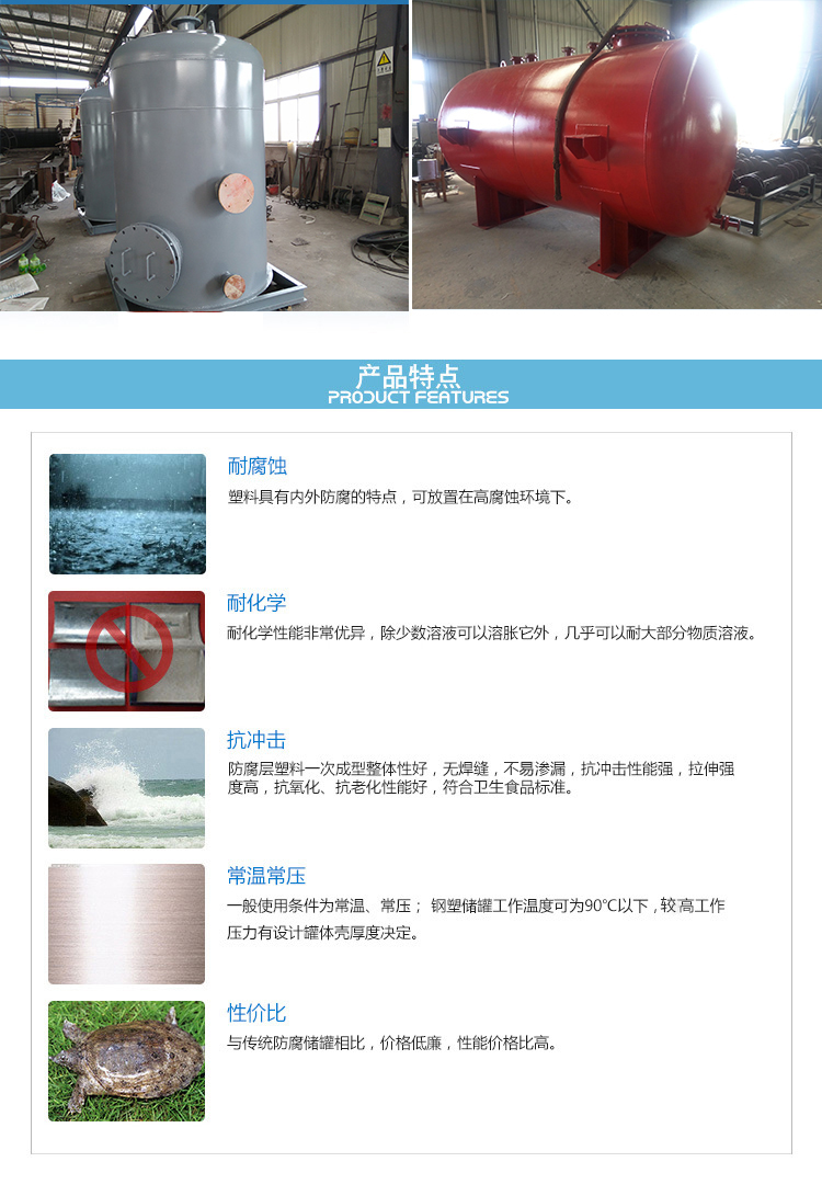 產(chǎn)品優(yōu)勢(shì):我公司全塑及鋼襯塑產(chǎn)品既具有整體一次成型無(wú)焊接縫,外形平整光滑,抗沖擊,維修方便、耐高低溫,抗老化,不滲漏、耐酸、堿、鹽,壽命長(zhǎng)、符合衛(wèi)生標(biāo)準(zhǔn)等優(yōu)點(diǎn),使用性能優(yōu)于傳統(tǒng)的玻璃鋼、PVC等!